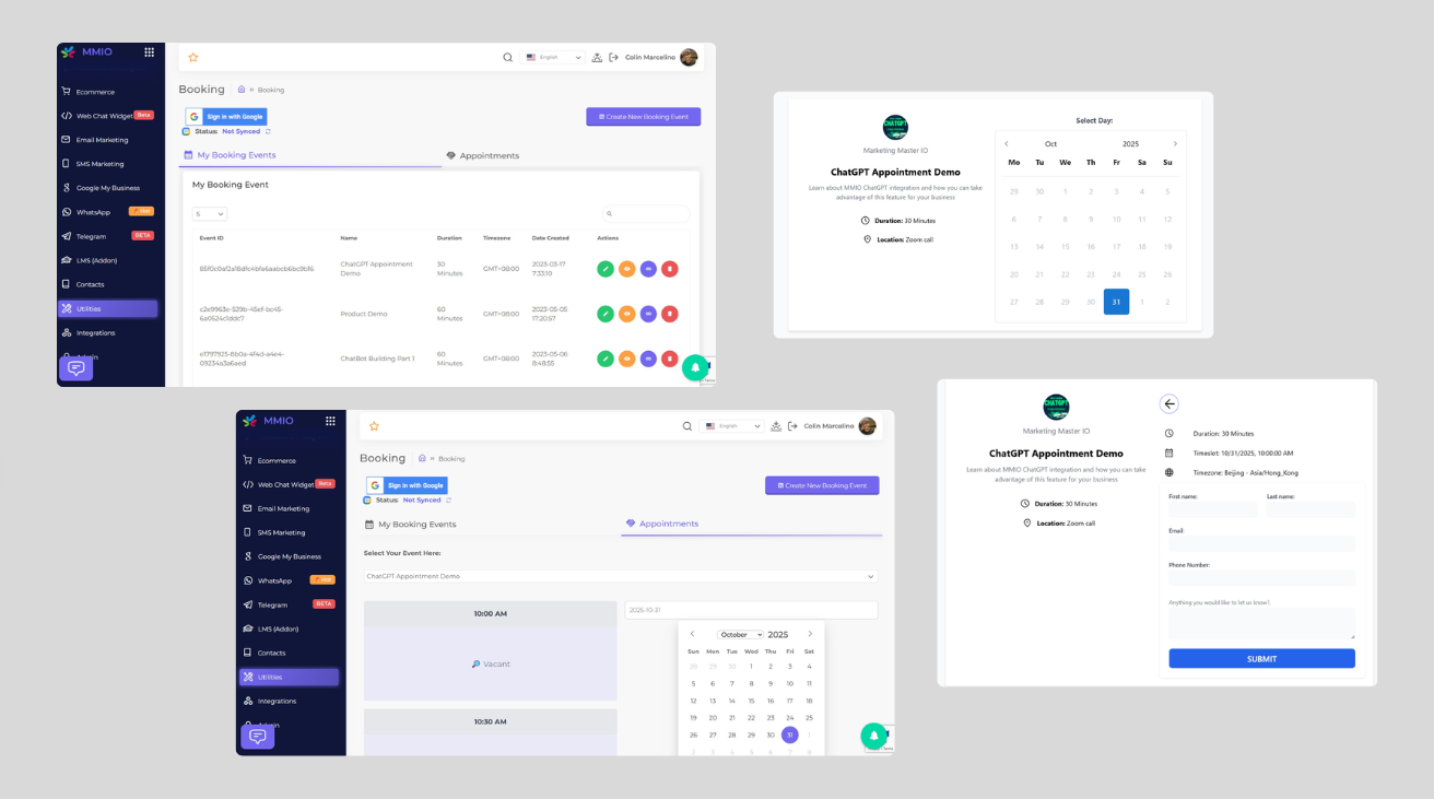 Whether you’re setting up a ChatGPT Appointment Demo, a Product Walkthrough, or a Client Consultation, MMIO Booking keeps everything organized in one place.