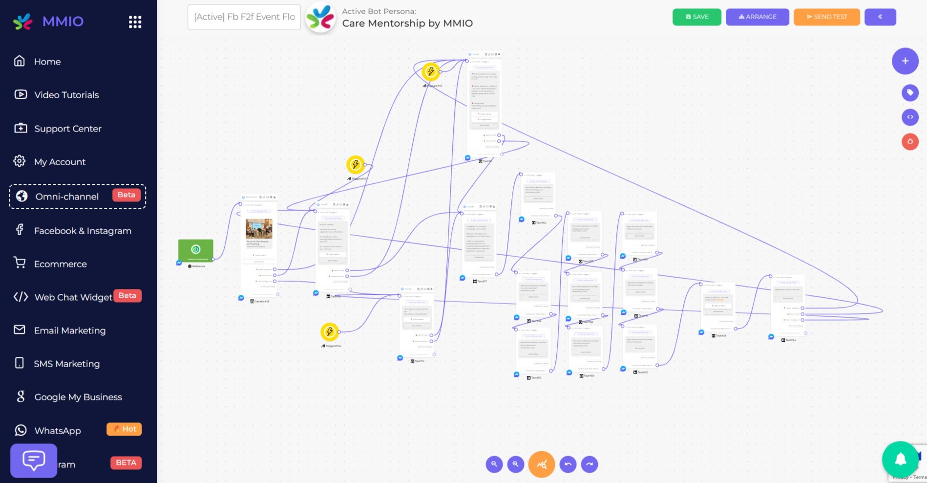 The Care Mentorship Bot shown here demonstrates how businesses can create dynamic, personalized conversations across Facebook, Instagram, and Web Chat — all without a single line of code.